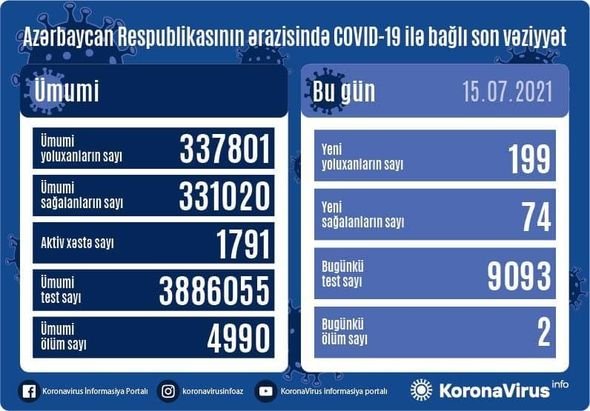 Azərbaycan Respublikasında koronavirus (COVID-19) infeksiyasına 199 yeni yoluxma faktı qeydə alınıb, 74 nəfər müalicə olunaraq sağalıb.